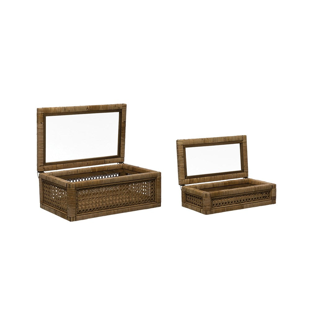 Woven Rattan & Wood Display Box with Glass Lid. Clear glass on the lids allow the contents of each container to be seen without opening. These amazing rattan boxes are perfect for storing items on the dresser or any shelf. They can also be stood upright with something special displayed inside.