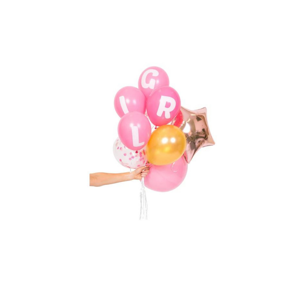 9 balloons per pack Included in your Baby Girl Pack: 1 -17" roundpink balloon, 1 - mylar rose gold star balloon,4 - 11" printed latex balloons 'G' 'I' 'R' 'L', 1-gold 11" metallic gold balloon, 2 clear pre-filled confetti balloons. Balloons come flat and deflated. Works best to inflate with a hand pump or helium. Confetti Balloons are pre-filled. Use static after balloons are inflated to make confetti stick to sides. Comes with instructions and glue dots to make phrase stand out! Designed and made in the USA and packaged in our studio in Oregon!