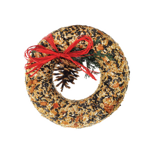 Solid seed, nut, and fruit wreath that is almost too good to give to the birds. Easy to hang up with a raffia bow.