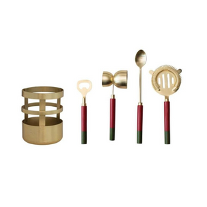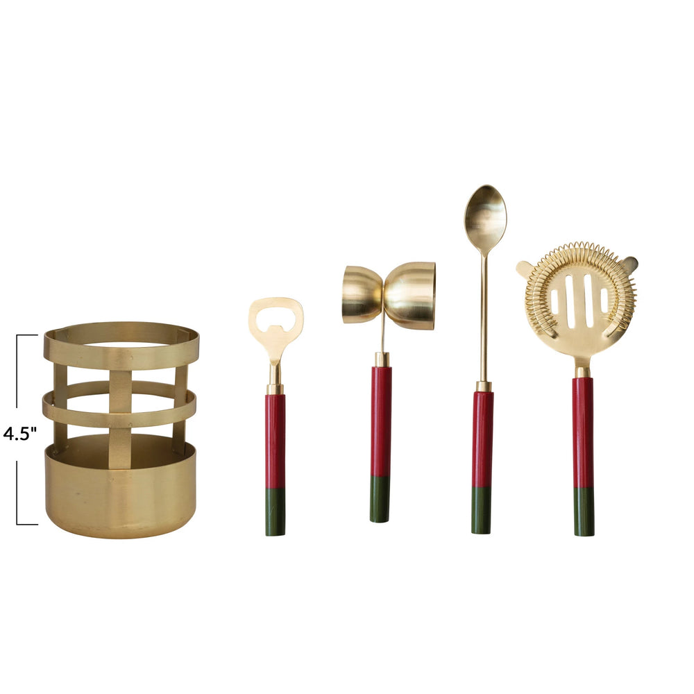 Stainless Steel Bar Tools w/ Resin Handles & Container, Red, Green & Gold Finish, Set of 5