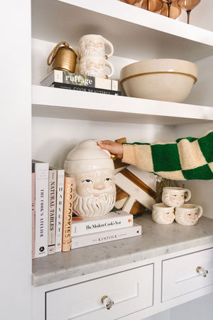 Bring the magic of the holidays to your home with this large Sweets and Treats storage container, holds one gallon of goodies. Perfect for cookies and confections, baking flour, sugar, candy, pet treats, and seasonal floral arrangements with lid removed. This ceramic likeness of the jolly ol' elf is perfect for putting out treats on Santa’s big night!
