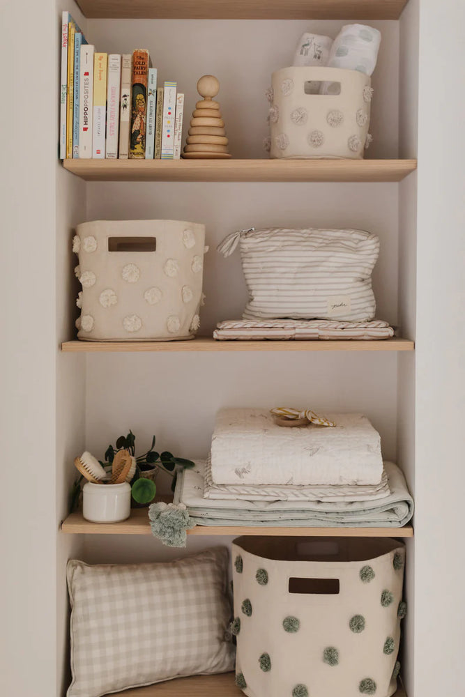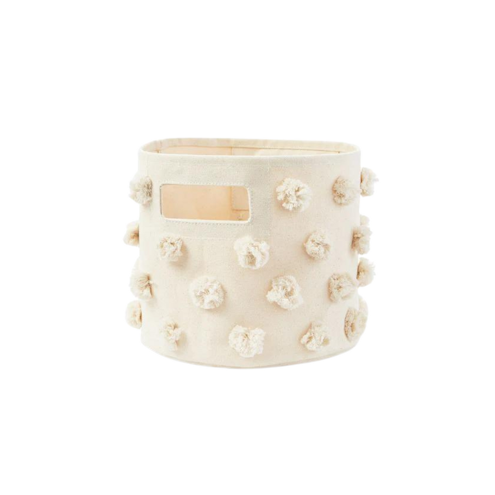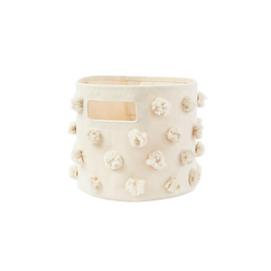 Declutter and update your decor with this durable cotton-canvas storage Pint that is perfect for diapers, creams and other small stuff! With each Pom Pom sewn by hand, it will add a pop of playfulness to any room.