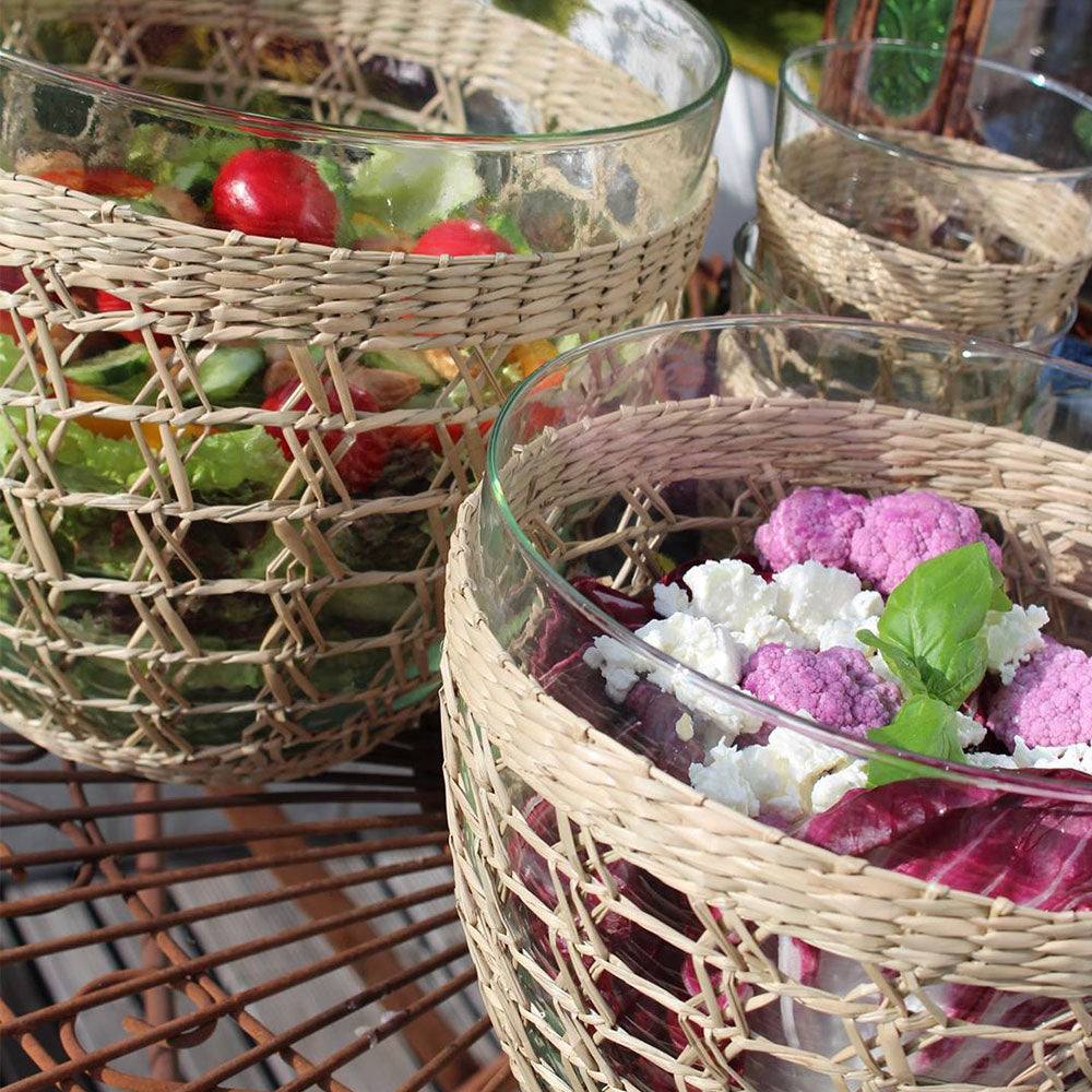 Seagrass Cage Bowl features a classic salad bowl with a tall profile making it ideal for tossing your favorite dress greens together or holding your favorite fresh fruits. Caged detailed seagrass wrapping covers all but top. Natural wraps on pitchers and matching glassware make festive pieces for indoor and outdoor drinking and dining.