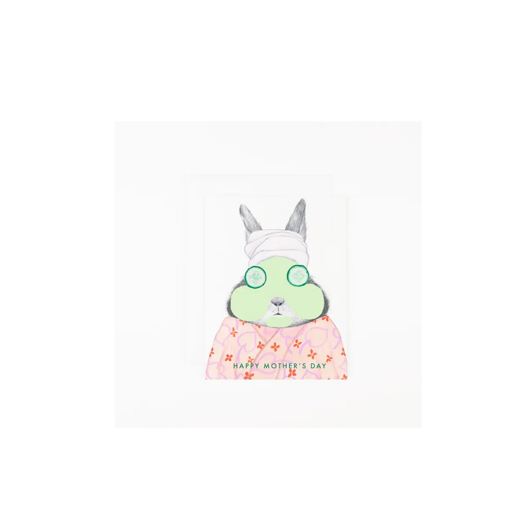 Hand drawn Bunny with a green facial mask and cucumbers with a floral robe with text that reads "Happy Mother's Day".